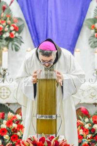 Ao final, os óleos preparados durante a Celebração, foram distribuídos às paróquias para serem utilizados ao longo do ano nos sacramentos do Batismo, da Crisma, da Unção dos Enfermos e das Ordenações.